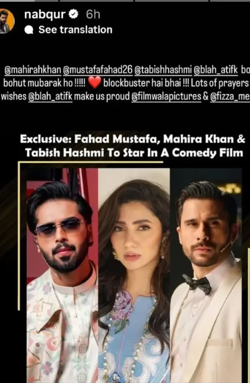 Director Nabeel Qureshi shared a screenshot of the film's post on his Instagram story and congratulated the main cast while tagging them, saying that this film will prove to be a blockbuster.