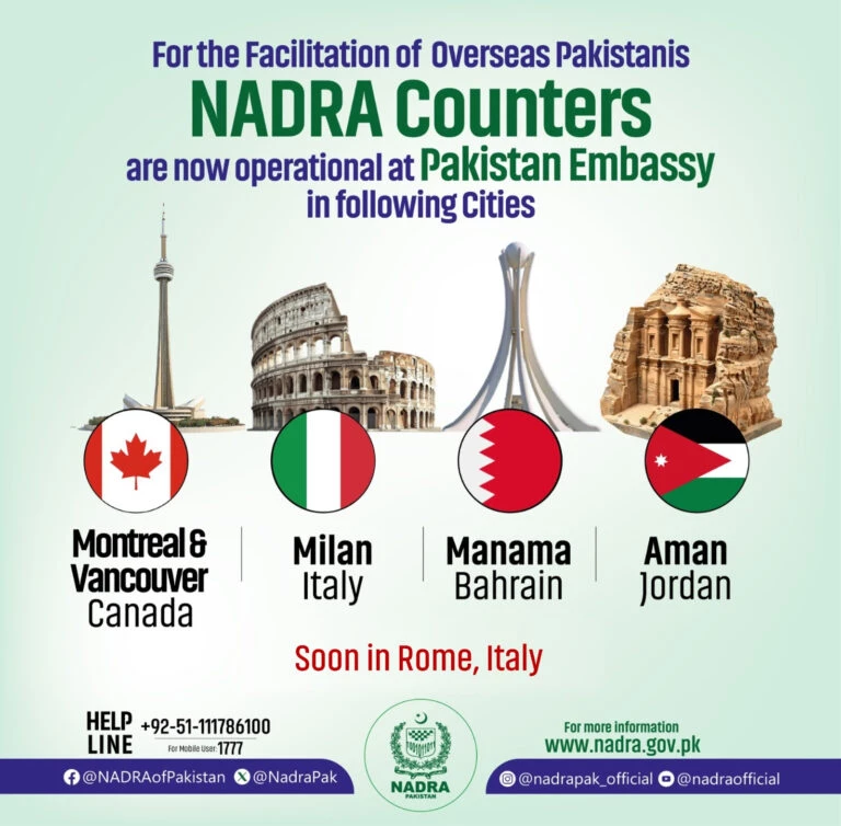 According to a NADRA spokesperson, NADRA counters in the Canadian cities of Montreal and Vancouver, Milan in Italy, Manama in Bahrain, and Amman in Jordan have now become fully operational. Through these counters, Pakistani citizens living abroad will be able to easily obtain a National Identity Card (CNIC), NICOP, and other important services.