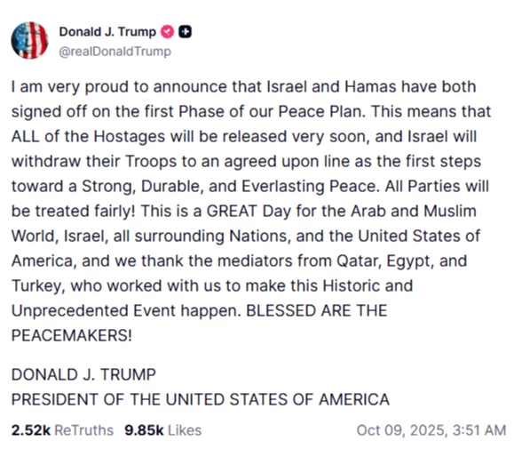 US President Donald Trump announced in a message on social media that under the deal, all hostages will be released soon, while Israel will withdraw its troops to the agreed line.
