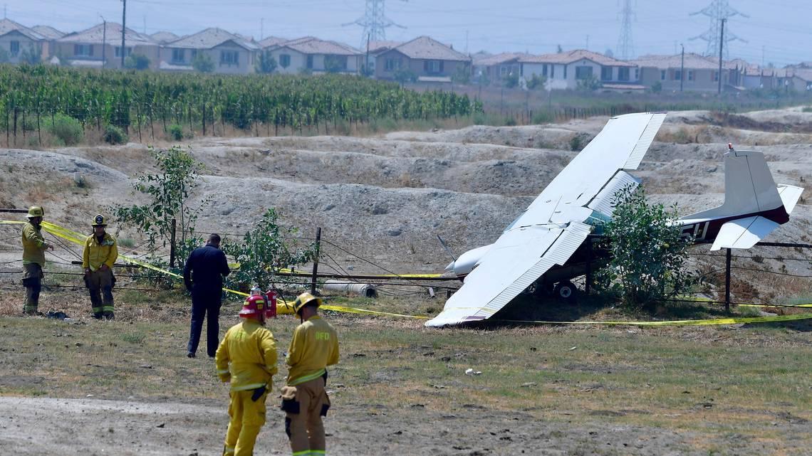 TV news footage from the scene showed the single-engine Cessna stopped with its left wing in the grass near a main road in Ontario, about 40 miles (64 kilometers) east of downtown Los Angeles.