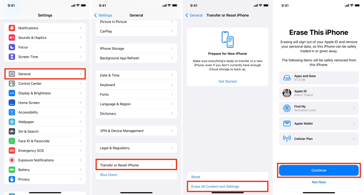 آئی فون کو ری سیٹ کرنے کے لیے سیٹنگز میں جائیں، جنرل میں جائیں، ٹرانسفر اور ری سیٹ آئی فون کے آپشن پر کلک کریں، اس کے بعد اریز آل کانٹینٹ اینڈ سیٹنگز پر ٹیپ کریں۔