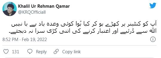 خلیل الرحمٰن قمر نے مائیکروبلاگنگ ویب سائٹ ٹوئٹر پر وزیرِ اعظم پاکستان سے اپنے پرانے وعدے یاد رکھنے کی گزارش کی ہے۔
