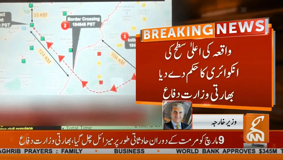 بھارتی وزارت دفاع کا کہنا ہے کہ میزائل غلطی سے چلا، معذرت خواہ ہیں، واقعہ معمول کی مرمت کے دوران تکنیکی خرابی کے باعث پیش آیا، بھارتی حکومت نے واقعہ کا سنجیدگی سے نوٹس کے کر اعلیٰ سطح کی انکوائری کا حکم دے دیا ہے، اطلاع ملی ہے کہ بھارتی میزائل پاکستان کے علاقے میں جاگرا ہے، اس واقعے پر انتہائی افسوس ہے، میزائل سے جانی نقصان نہ ہونے پر اطمینان ہوا۔