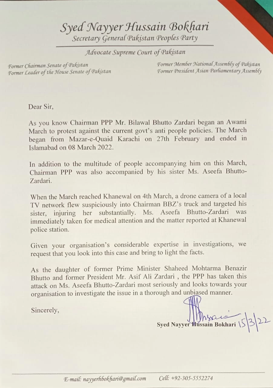 پیپلز پارٹی نے ڈی جی آئی ایس لیفٹیننٹ جنرل ندیم انجم کو باضابطہ طور پر مراسلہ تحریر کردیا,مراسلہ پیپلز پارٹی کے سیکریٹری جنرل نیئر حسین بخاری کی جانب سے تحریر کیا گیا۔