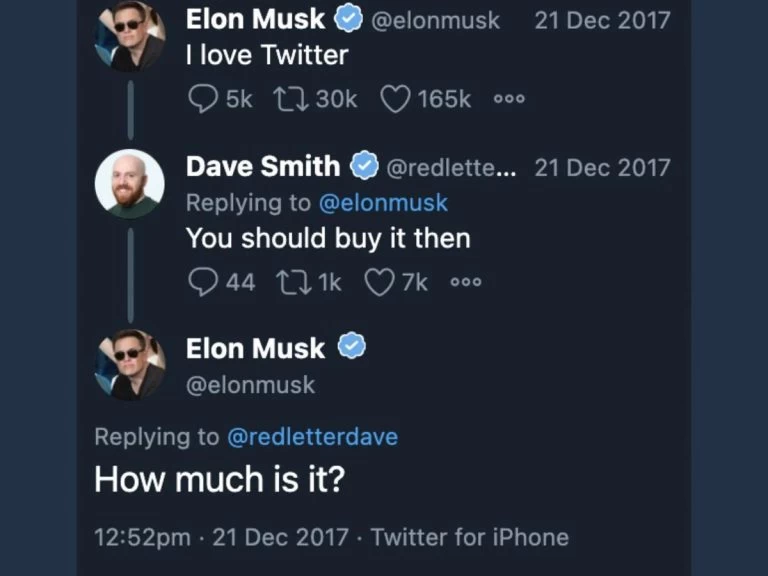 21 دسمبر 2017 کو ایلونمسک نے ایک ٹویٹ کہاتھا کہ مجھے ٹوئٹر سے پیار ہے۔ اس ٹویٹ کے جواب میں ایک صارف نے انہیں ٹوئٹر خریدنے کا مشورہ دیا تھا ۔
