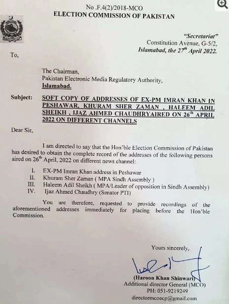 الیکشن کمیشن نے سابق وزیراعظم عمران خان کے پشاور میں ہونے والے ورکرز کنونشن کے خطاب کا ریکارڈ پیمرا سے طلب کرلیا ہے۔