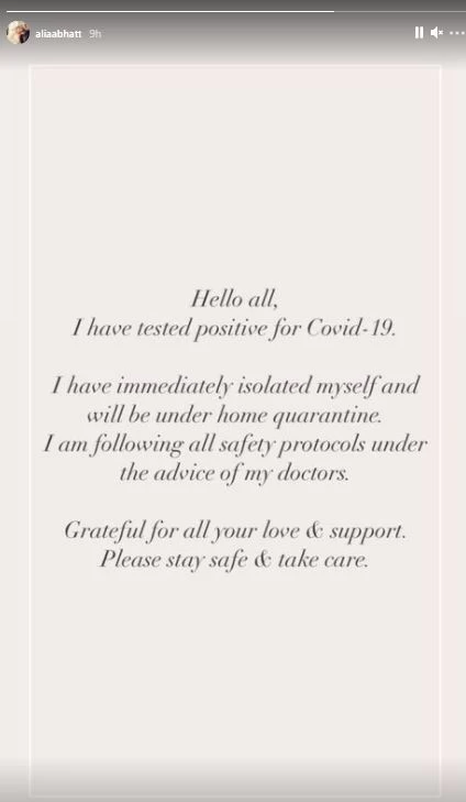 واضح رہے کہ گزشتہ ماہ عالیہ بھٹ کے قریبی دوست اداکار رنبیر کپور بھی کورونا وائرس کا شکار ہوئے تھے ۔ جس کے بعد عالیہ بھٹ کے ٹیسٹ کی رپورٹ منفی آئی تھی۔