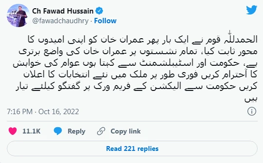فواد چودھری نے اپنے ٹویٹر بیان میں کہا ہے کہ تمام نشستوں پر عمران خان کی واضح برتری ہے، حکومت اور اسٹیبلشمنٹ سے کہتا ہوں عوام کی خواہش کا احترام کریں۔