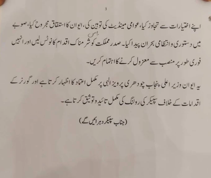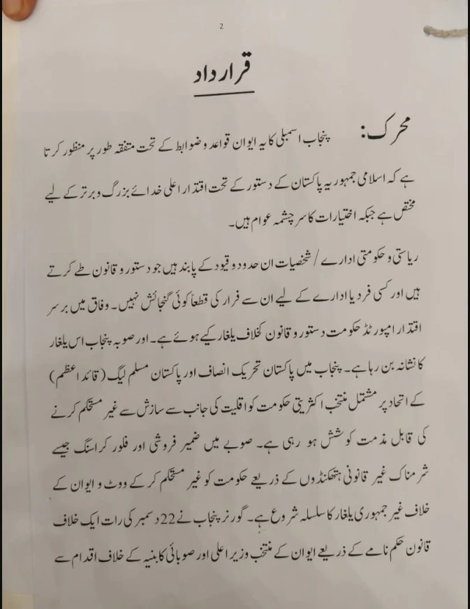 تفصیلات کے مطابق قرارداد کےمتن میں لکھا گیا کہ پنجاب اسمبلی کاایوان قواعد و ضوابط کےٗتحت منظور کرتا ہے کہ دستور کے تحت اقتدار اعلی خدائے بزرگ برتر اور اختیارات عوام کے پاس ہے،امپورٹڈ حکومت پنجاب پر یلغار کئے ہوئے ہے پنجاب اس یلغار کا نشانہ بن رہاہے،اکثریتی حکومت کو غیر مستحکم کرنے کی کوشش کی جا رہی جس کی مذمت کرتے ہیں۔