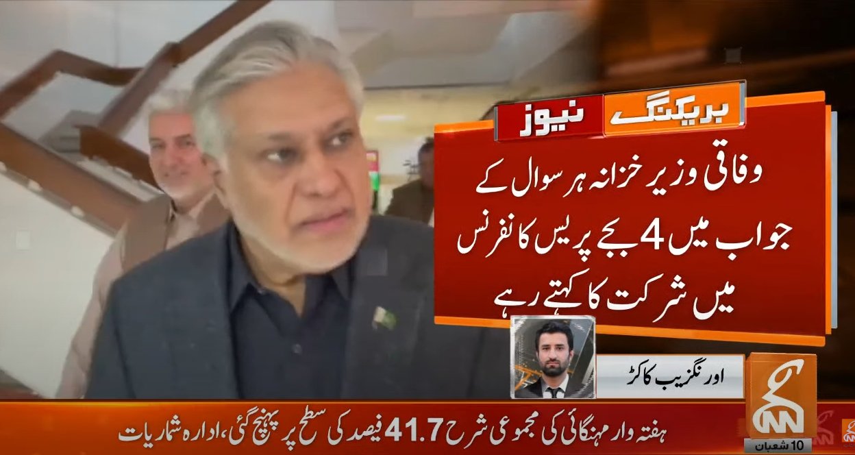 پارلیمنٹ ہاؤس میں صحافیوں سے گفتگو کے دوران ایک صحافی نے اسحاق ڈار سے سوال کیا کہ موجودہ معاشی صورت حال پر حکومتی حکمت عملی کیا ہے؟، جس پر وزیر خزانہ نے جواب دیا کہ 4 بج کر 10 منٹ پر پریس کانفرنس کروں گا۔