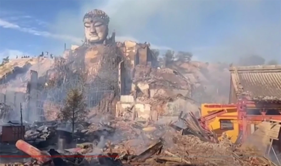 سوشل میڈیا پر شیئر کی گئی ویڈیوز میں دکھایا گیا ہے کہ شینڈن کاؤنٹی کے عظیم بدھ مندر میں مورتی کو پیر کی صبح شعلوں میں گھرا ہوا ہے۔