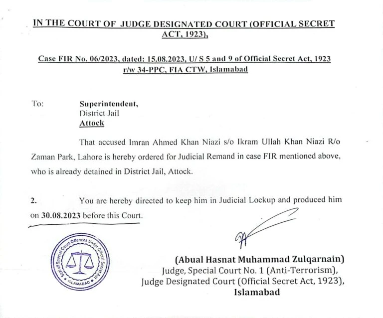 سائفر کیس میں عمران خان کا جوڈیشل ریمانڈ منظور کرتے ہوئے عدالت نے 30 اگست کو پیش کرنے کا حکم دے دیا۔ آفینشل سیکرٹ عدالت نے تحریری حکم نامہ سپرنٹنڈنٹ اٹک جیل کو بھجوا دیا۔