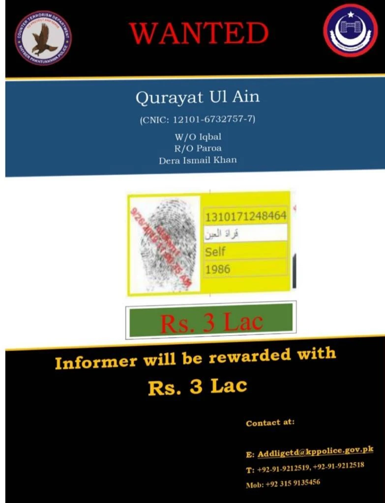 پہلے مرحلے میں جو فہرست آئی، اس میں مطلوب افراد کی تعداد 135 تھی، جس میں ایک خاتون کا نام بھی شامل ہے ۔ جس کی سر کی قیمت 3لاکھ روپے مقرر ہے۔ 37 سالہ دہشت گرد قراۃ العین کا تعلق حویلیاں ایبٹ آباد سے ہے اور اس نے اسلام آباد کی جامعہ حفصہ سے تعلیم حاصل کی تھی ۔ قراۃ العین کی شادی ڈیرہ اسماعیل خان کے تحصیل پروا رہائشی اقبال عرف بالی سے ہوئی ہے۔ قراۃ العین کا شوہر اقبال عرف بالی مشہور ٹارگٹ کلر تھا جو30کے قریب پولیس افسران اور اہلکاروں کے قتل میں ملوث تھا۔