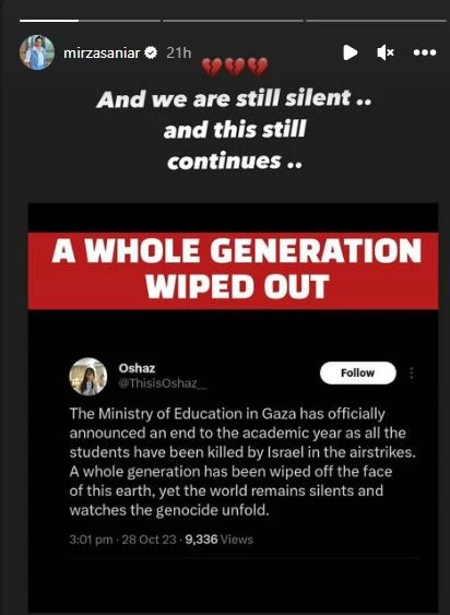 ثانیہ مرزا نے اپنی انسٹا اسٹوری پر اکتوبر کے آغاز سے غزہ میں جاری اسرائیل کی وحشیانہ بمباری میں فلسطینی بچوں کی ہلاکتوں پر دنیا کی خاموشی کو اجاگر کرتی ایک سوشل میڈیا پوسٹ شیئر کی ہے۔