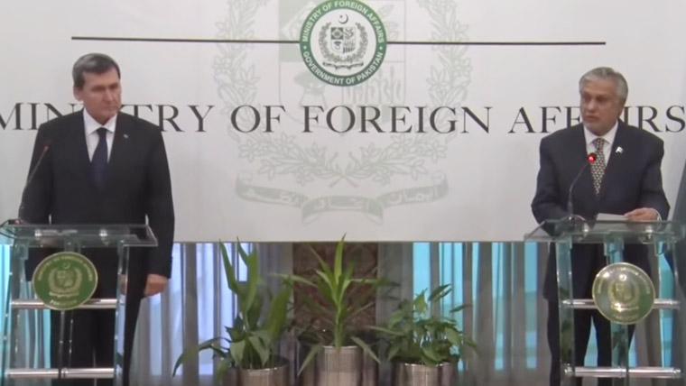 پاکستان اور ترکمانستان کے وزرائے خارجہ کی مشترکہ پریس کانفرنس نے خطاب کرتے ہوئے نائب وزیر اعظم اسحاق ڈار کا کہنا تھا کہ پاکستان اور ترکمانستان کے درمیان تاریخی تعلقات ہیں ، ہم نے اعلیٰ سطح کے مذاکرات اور تبادلوں کے فروغ پر اتفاق کیا ہے۔ خوشی ہے کہ پاکستان اور ترکمانستان کے تعلقات مثبت سمت کی طرف بڑھ رہے ہیں ، ملاقات میں ہم نے دوطرفہ ایجنڈے کے ساتھ علاقائی و عالمی پیشرفت کا احاطہ بھی کیا، دونوں ممالک کے عوام ایک دوسرے سے مضبوط تعلقات چاہتے ہیں ۔