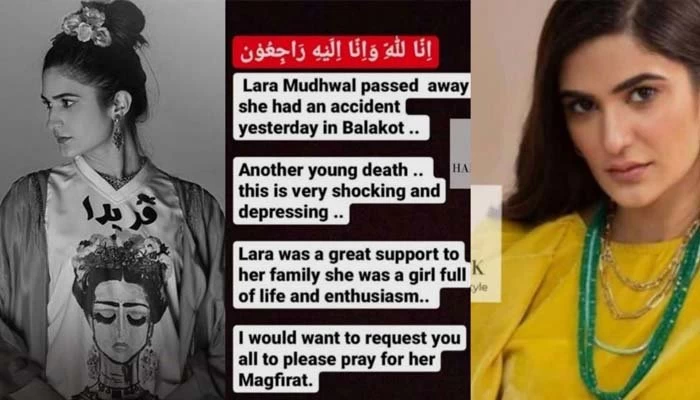 میڈیا رپورٹس کے مطابق معروف پاکستانی فیشن ماڈل لارا کے قریبی دوست کی جانب سے اطلاع سوشل میڈیا پر شیئر کی گئی ۔27سالہ لارا کا انتقال بالاکوٹ ٹریفک حادثے میں ہوا ۔سو شل میڈیا پر شئیر کردہ پوسٹ میں اداکارہ کی مغفرت کیلئے دعا کی درخواست بھی کی گئی ہے۔ سوشل میڈیا صارفین کی جانب سے جواں سالہ ماڈ ل کی وفات پر دکھ کا اظہار کیا گیا ہے۔