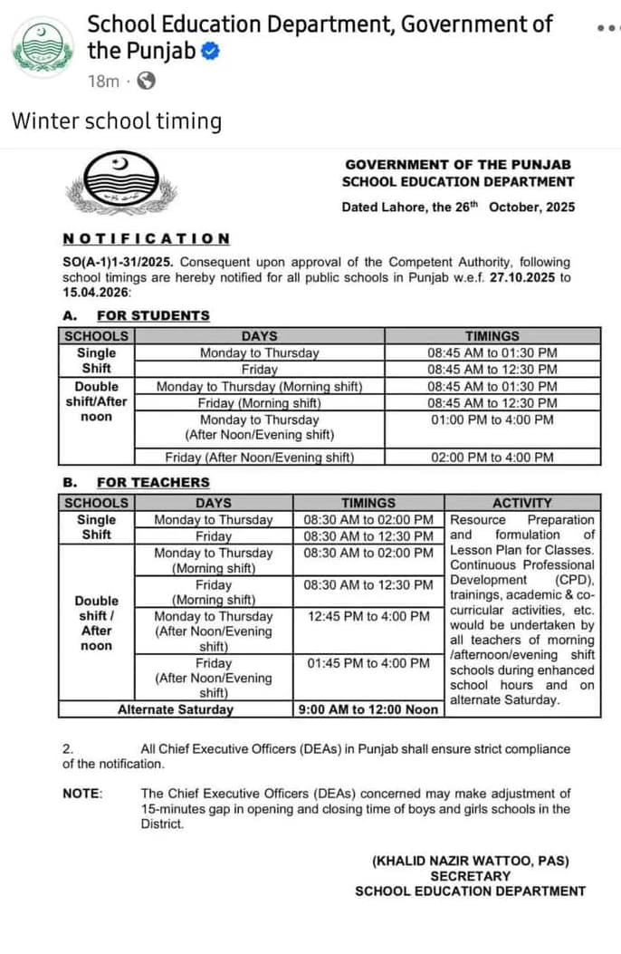 پنجاب کے وزیرِ تعلیم رانا سکندر حیات نے سماجی رابطے کی ویب سائٹ ایکس (سابقہ ٹوئٹر) پر اپنے بیان میں کہا کہ موجودہ اسموگ کی صورتحال کے پیشِ نظر سردیوں کے دوران اسکولوں کے نئے اوقات صبح 8:45 سے دوپہر 1:30 بجے تک ہوں گے۔