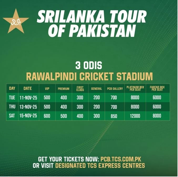 پاکستان اور سری لنکا کے درمیان ون ڈے انٹرنیشنل سیریز کے ٹکٹس آج سے آن لائن فروخت کے لیے دستیاب ہوں گے۔