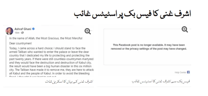 اشرف غنی نے کابل پر طالبان کے کنٹرول کے باعث ملک سے فرار ہونے کے بعد نامعلوم مقام سے فیس بک پر اپنے تصدیق شدہ اکاؤنٹ کے ذریعے پہلا بیان جاری کیا تھا ۔