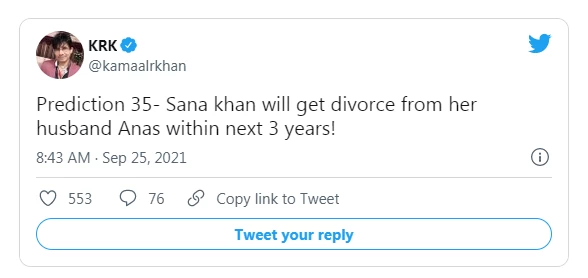 یہ پیشگوئی فلمی ناقد کمال راشدخان المعروف کے آر کے کی جانب سے ٹوئٹر پر جاری اپنے ایک پیغام میں کی گئی ہے ۔ کے آر کے نے اپنی پیشگوئیوں پر مبنی ٹویٹ نمبر 35 میں کہا ہے کہ آئندہ تین سالوں میں اداکارہ اور ان کے شوہر کی طلاق ہوجائیگی ۔