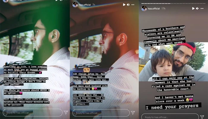 معروف وی لاگر و یوٹیوبر حسام احمد اعوان نے فوٹو اینڈ ویڈیو شئیرنگ ایپ انسٹاگرام پر مختلف اسٹوریز کے ذریعے مداحوں کو طلاق کے حوالے سے آگاہ کیا۔ انہوں نے اپنی پوسٹ میں لکھا کہ ایک نئی زندگی کا آغاز، سنبھلنے میں وقت لگے گا لیکن زندگی نے اہم سبق سِکھا دیے ہیں۔ ایک اور اسٹوری میں حسام نے تمام تر میسجز کے جواب میں بس اتنا بتایا کہ شمائلہ نے عدالت میں ان سے خلع کا کیس دائر کیا ہے۔ زندگی بھروسے، سمجھوتے کا نام ہے، خلع یا طلاق اس کا کبھی بھی حل نہیں رہا ہے، مغرب میں چھوٹی چھوٹی بات پر لوگ الگ ہوجاتے ہیں تب ہی وہاں طلاق کی شرح 98 فیصد ہے۔