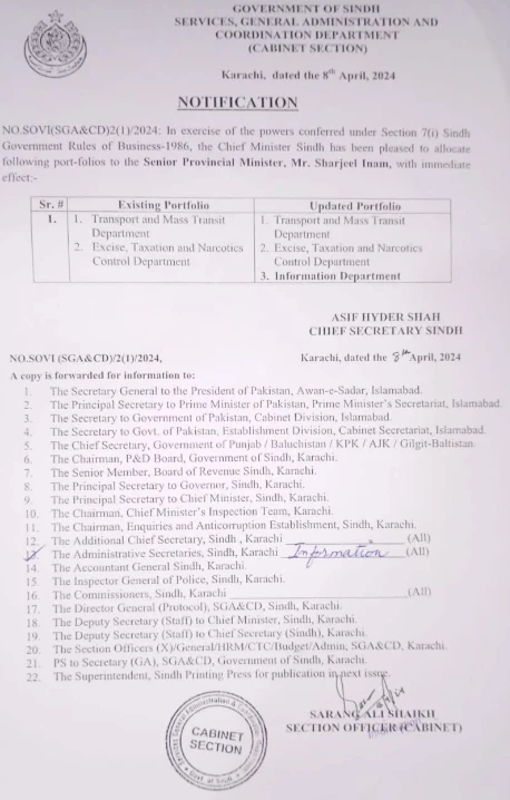 According to the details, the notification has been issued regarding the allocation of ministry of information to Sharjeel Inam Memon. Earlier that Sharjeel also has been given the transport and excise department of Sindh.