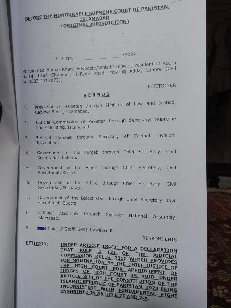 Akmal Khan, a lawyer who has mentioned himself as a whistle blower in the plea, has challenged the existing ways of appointments of judges in the high courts as well as the Supreme Court of Pakistan.