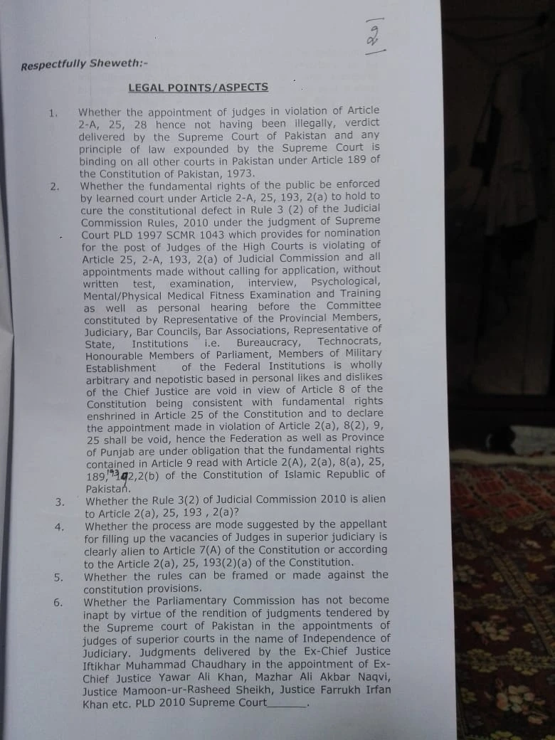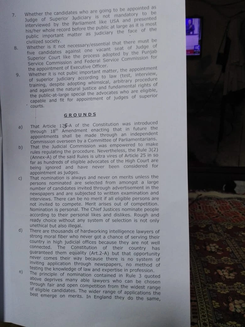 The petitioner also brought it to the light that there are thousands of hardworking intelligence lawyers of strong moral fiber who never got a chance of serving their country in high judicial offices because they are not well connected. The Constitution of their country has guaranteed them equality (Art.2-A) but that opportunity never comes their way because there is no system of inviting application through newspapers, no method of testing the knowledge of law and expertise in profession.