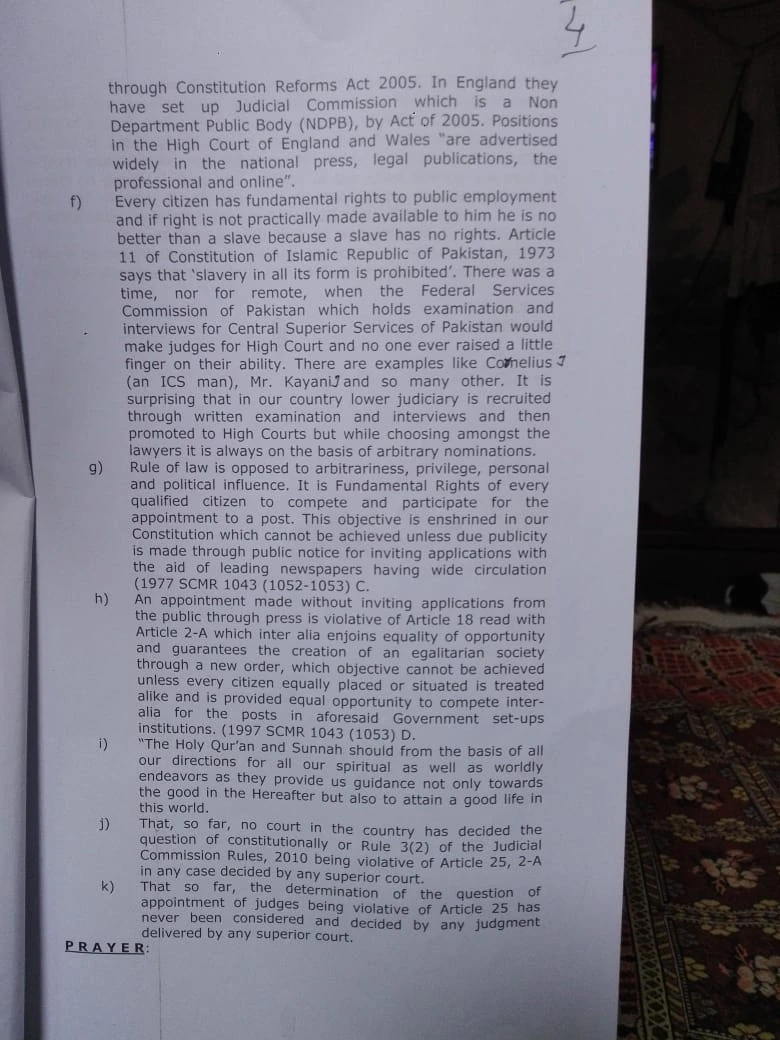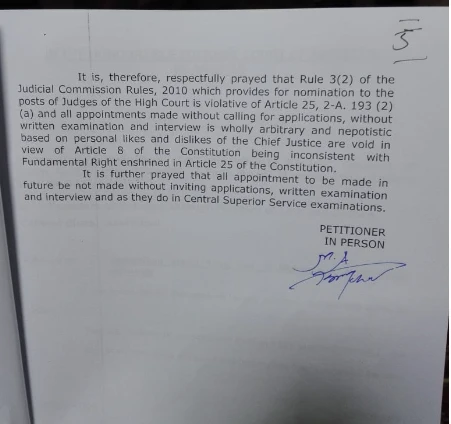 He prayed to the Supreme Court that Rule 3(2) of the Judicial Commission Rules, 2010 which provides for nomination to the posts of Judges of the High Court is violative of Article 25, 2-A. 193 (2) (a) and all appointments made without calling for applications, without written examination and interview is wholly arbitrary and nepotistic based on personal likes and dislikes of the Chief Justices are void in view of Article 8 of the Constitution being inconsistent with Fundamental Right enshrined in Article 25 of the Constitution.