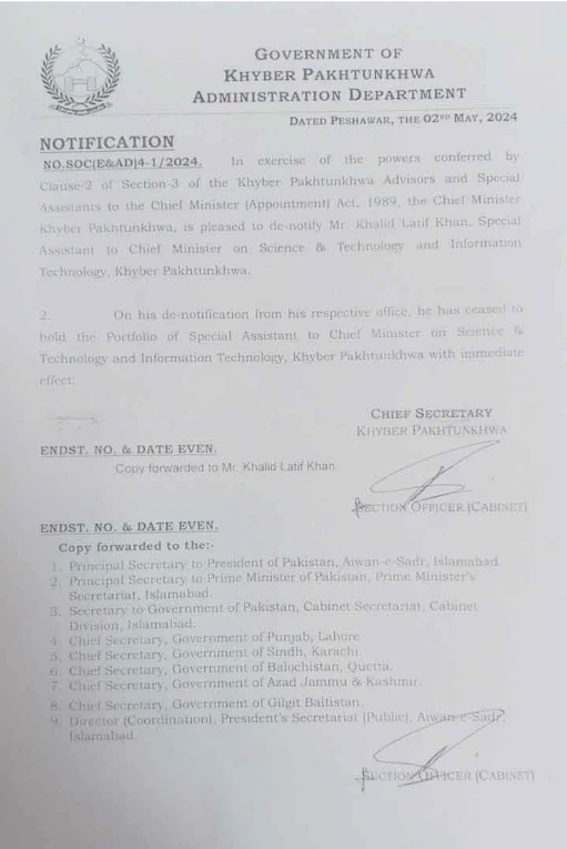 In a statement issued by the KP government, it has been said that the Chief Minister has de-notified Khalid Latif Khan from the post of Special Assistant to the Chief Minister for Science and Technology and Information Technology using his constitutional powers.