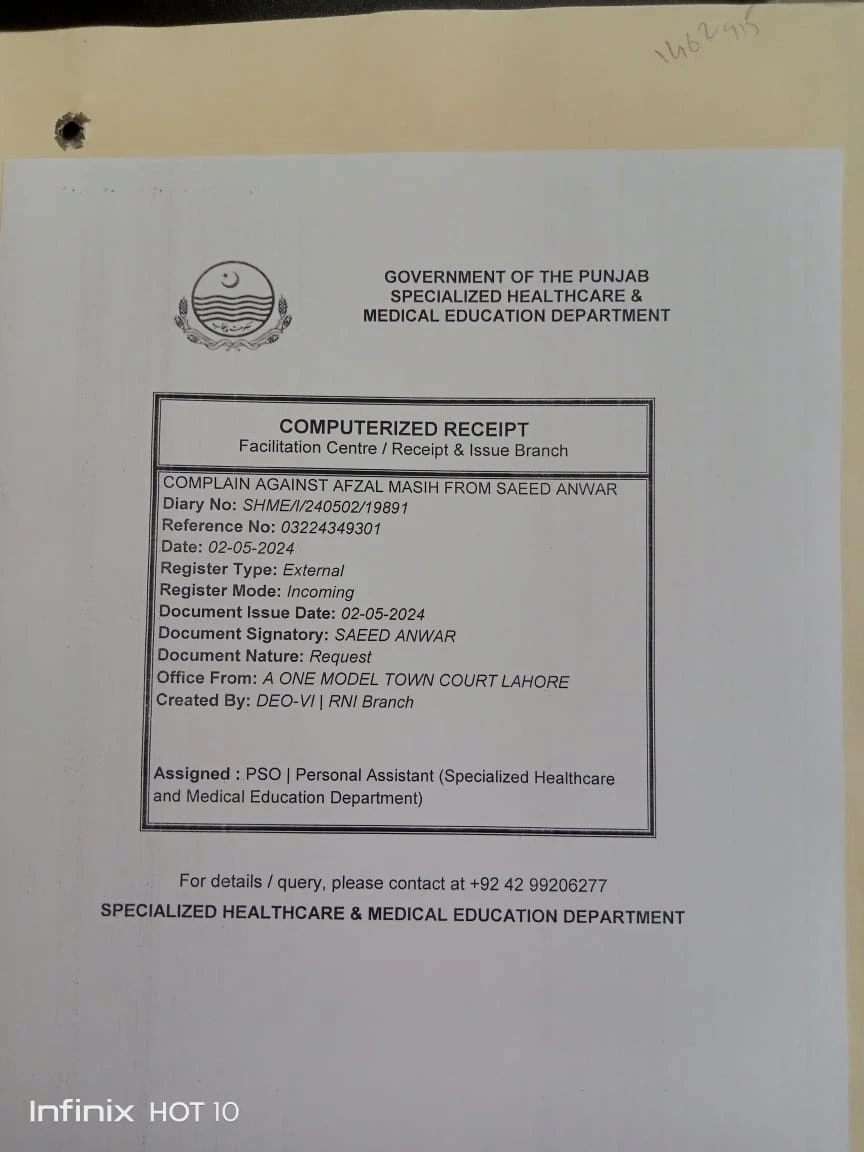 “Afzal Masih, an owner of a distributor company, secured the tenders through the connivance of some people,” said the complaint. Afzal Masih, according to the complaint, worked with a private company associated with Services Hospital. He was a wire repairer.