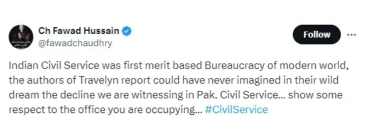 Fawad Chaudhry wrote: “Indian civil service was first merit-based Bureaucracy of modern world, the authors of Travelyn report could have never imagined in their wild dreams the decline we are witnessing in Pakistan Civil Service. Show some respect for the office you are occupying.