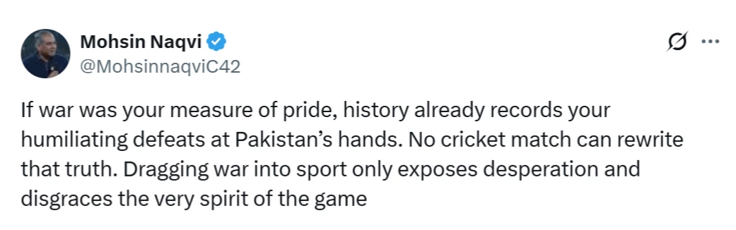 Mohsin Naqvi, while responding to Modi’s statement, said that if war is the measure of your pride, history already records your humiliating defeat by Pakistan. No cricket match can change the truth.