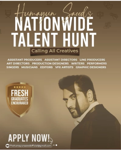 In a message on social media, Humayun Saeed invited the youth to be a part of this creative field, whether they want to act on screen or take on various responsibilities behind the scenes.