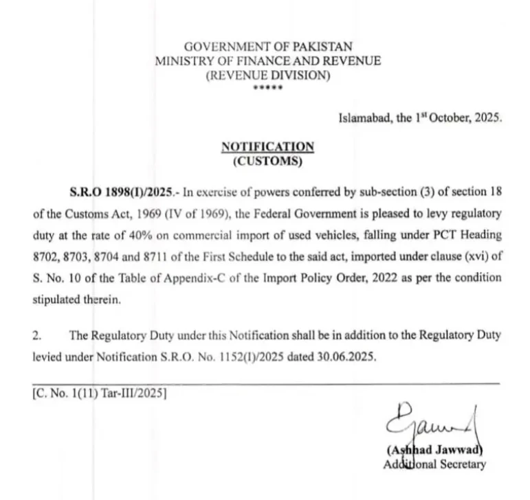 Islamabad: The federal government has imposed an additional 40 percent regulatory duty tax on the import of used vehicles. After the cabinet approval, the Federal Board of Revenue (FBR) has also issued a notification.