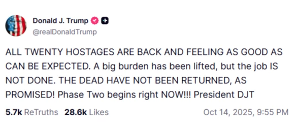 The US President said that all 20 hostages have returned from Hamas captivity in good health, a big burden has been lifted, but our work is not done.