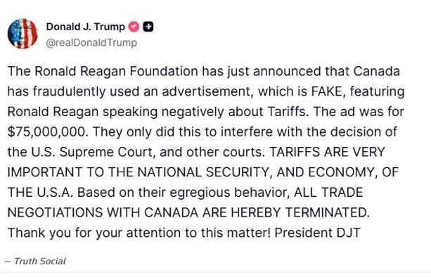 "Based on their egregious behavior, ALL TRADE NEGOTIATIONS WITH CANADA ARE HEREBY TERMINATED," Trump wrote on Truth Social.