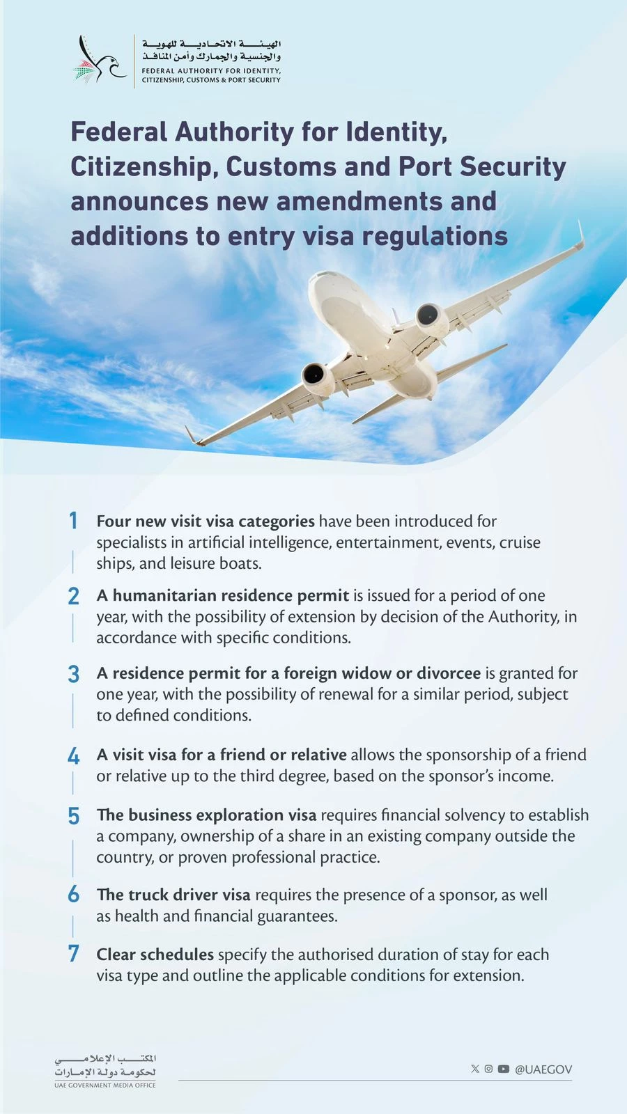 یو اے ای نے آرٹیفیشل انٹیلجنس کے ماہرین کے لیے خصوصی ویزہ جاری کرنے کا اعلان کیا ہے جبکہ مختلف ایونٹس، فیسٹیولز ، نمائش، کانفرنسز اور کھیلوں کی سرگرمیوں میں شرکت کے لیے نیا ایونٹ ویزہ بھی متعارف کرایا گیا ہے۔کروز شپ یا تفریحی شپ سے متحدہ عرب امارات آنے والے سیاحوں کو ملٹی پل انٹری ویزہ دیا جائے گا۔
