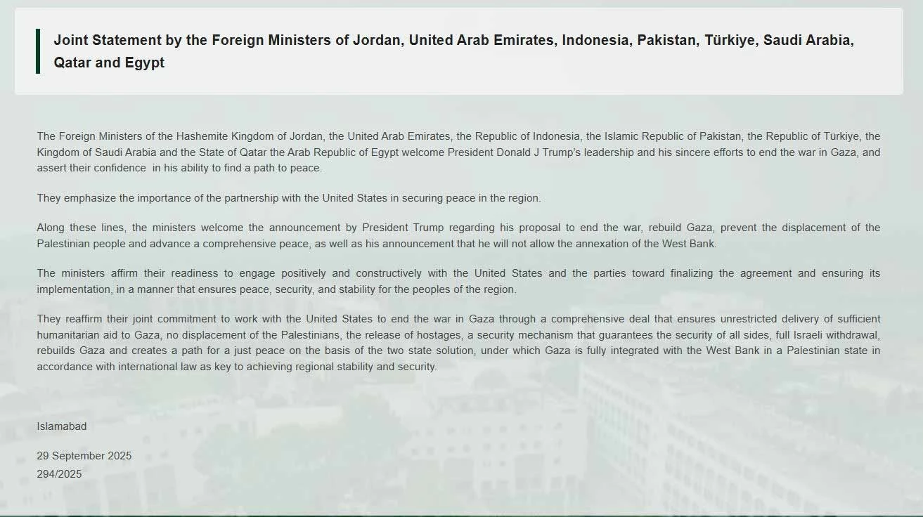 پاکستان، اردن، متحدہ عرب امارات، انڈونیشیا، ترکیہ، سعودی عرب، قطر اور مصر کے وزرائے خارجہ نے امریکی صدر ڈونلڈ ٹرمپ کی غزہ جنگ بندی کی کوششوں کی بھرپور حمایت کر دی۔