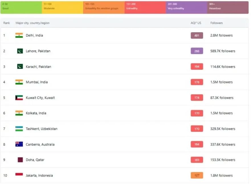 دنیا کے آلودہ ترین شہروں کی فہرست میں بھارت کا دارالحکومت دہلی ایک بار پھر پہلے نمبر پر آگیا ہے، جبکہ لاہور دوسرے نمبر پر موجود ہے۔ ماحولیاتی ماہرین کے مطابق دونوں شہروں کی فضا انسانی صحت کے لیے انتہائی خطرناک ہے۔