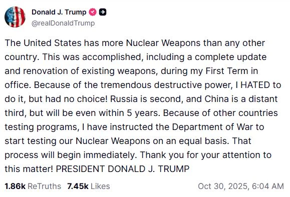 سوشل میڈیا پر جاری پیغام میں صدر ٹرمپ نے کہا کہ انہوں نے محکمہ جنگ کو نیوکلیئر ہتھیاروں کی ٹیسٹنگ کا حکم دیدیا اور یہ عمل فوری طور پر شروع کیا جائے گا۔