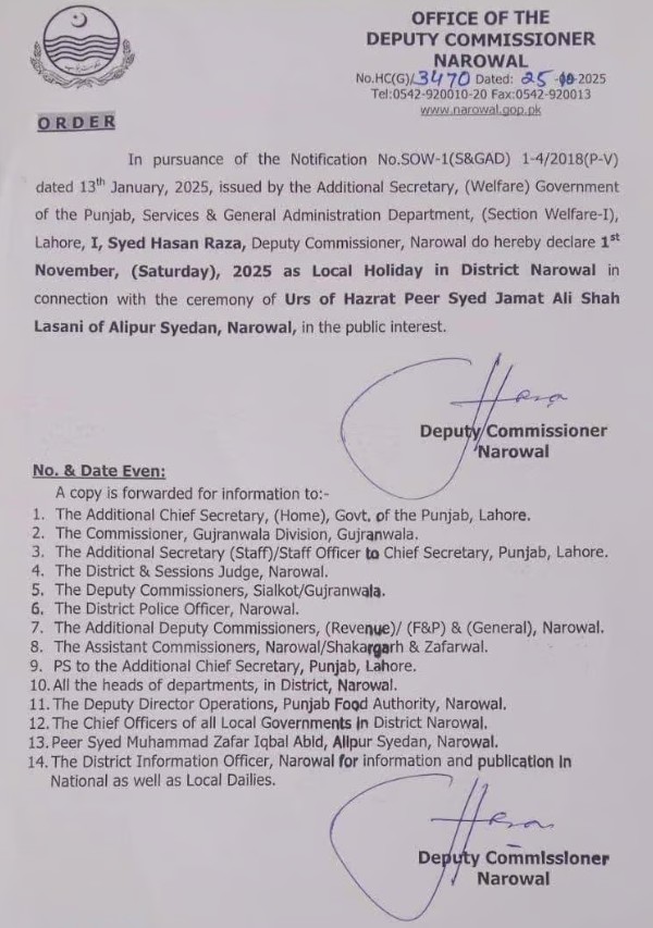 جاری کر دہ نوٹیفکیشن کے مطابق ضلع نارووال میں یکم نومبر بروز ہفتہ حضرت پیر سید جماعت علی شاہ لاثانی آف علی پور سیداں شریفؒ کے سالانہ عرس کے موقع پر عام تعطیل کا اعلان کیا گیا ہے۔